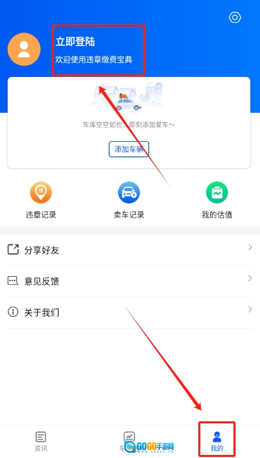 1、启动二手车违章查询华为版应用,在底部导航栏找到“我的”界面,点击进入后选择登录功能。