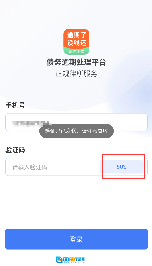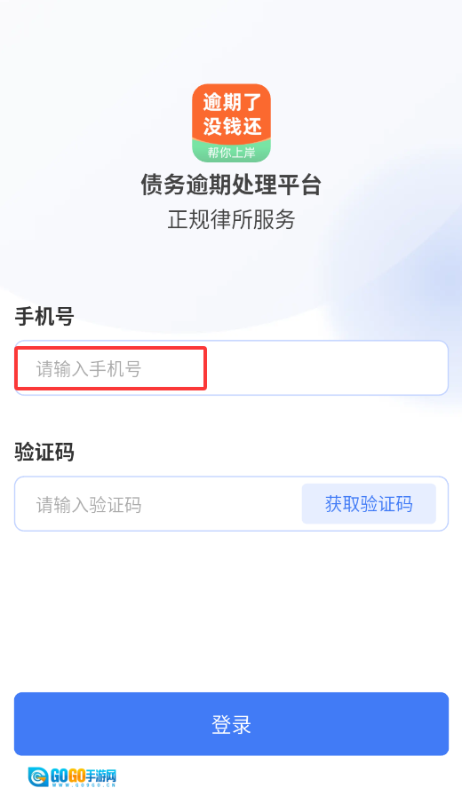 1、打开债务逾期处理平台后,在登录界面输入本人已完成实名认证的手机号码,以此完成身份验证。