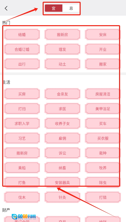2、进入吉日查询页面后,在各类选项中,选中 “宜选项”,接着从下拉菜单里点选 “搬新房”。