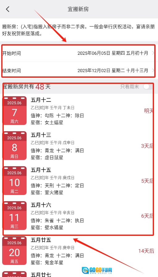 3、页面跳转完成后,根据自身需求挑选一个时间段,稍作等待,即可了解在这个时段里有哪些日期是适合搬家的。