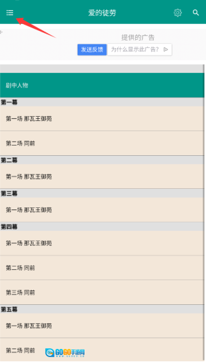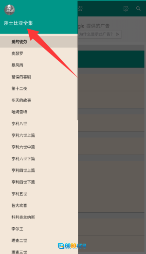 1、打开莎士比亚全集应用后,点击界面左上角的“目录”图标,即可展开包含作品分类的导航菜单。