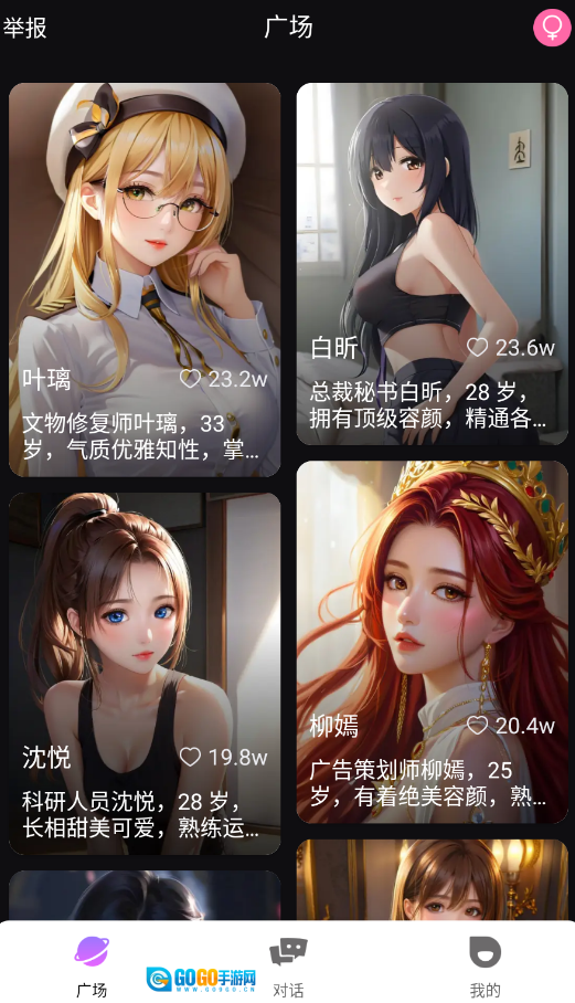 1、开启虚拟AI伴侣后,进入“广场”界面浏览,从中挑选自己感兴趣的AI聊天对象。