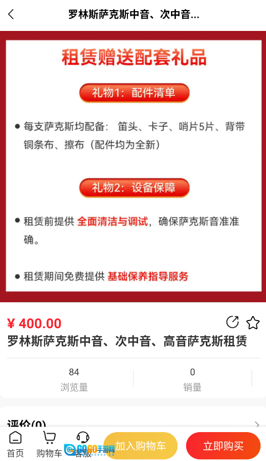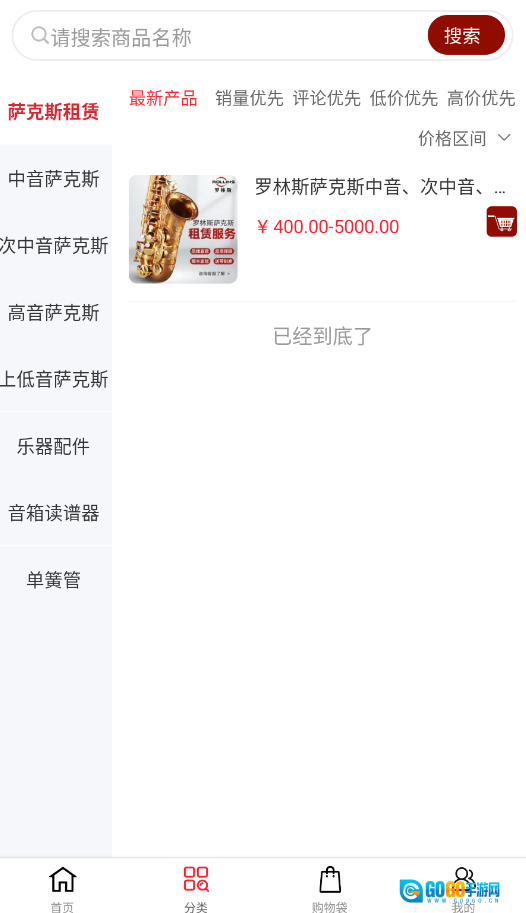 2、在分类页面浏览各类乐器商品时,可根据购买或租赁的不同需求来筛选目标产品。