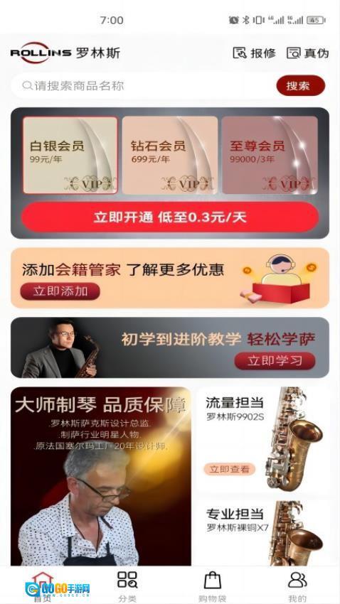 1、打开罗林斯商城应用后,点击页面底部导航栏中的“分类”选项,即可进入乐器类商品的列表页面。