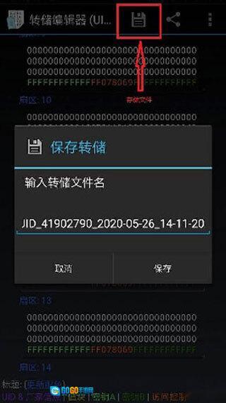 3、此时能看到卡片信息已成功读取,可点击右上角按钮将信息保存至本地。若读取时因卡片接触不良,致使部分扇区信息未读取完整,可尝试再次读取来解决。已存储的文件可通过主界面的“编辑/分析转储文件”功能打开。