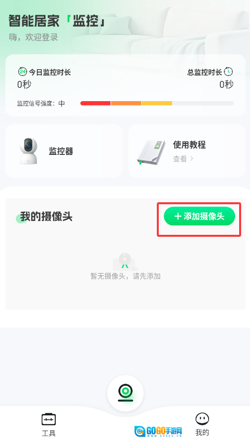 启动远程监控功能后,在首页找到并点击“添加摄像头”按钮,即可进入设备配置流程。