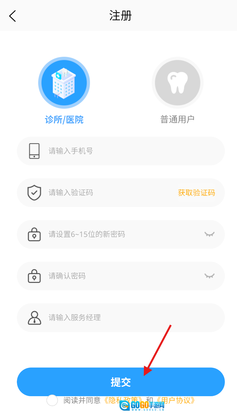 4、依据自身身份,选择诊所、医院或普通用户类别,填写信息后点击提交即可完成注册。