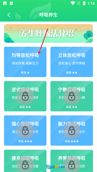 进入【呼吸养生】页面后,选择【均等放松呼吸】这一方法。