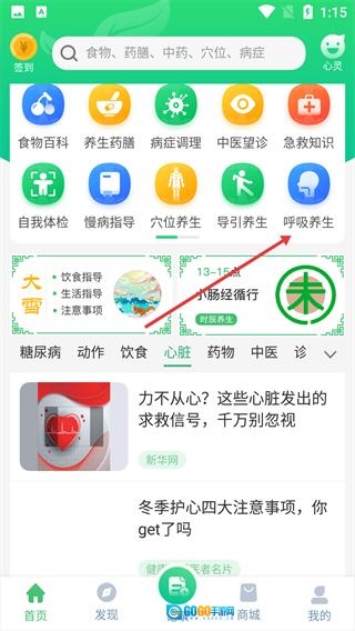 1、在首页功能区,找到【呼吸养生】选项并点击。