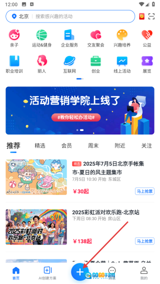 2、登录后进入【首页】,点击底部的【+】号,进入活动发布选择界面。