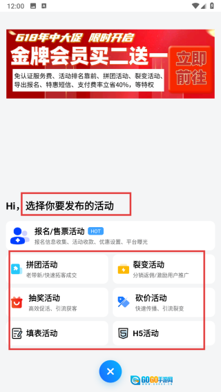 3、在发布页面选择【报名/售票活动】等类型,然后按照流程填写相关信息并发布活动。