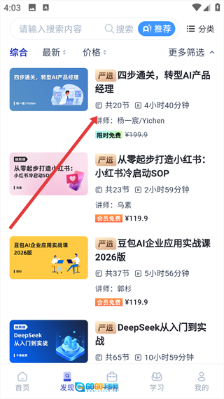 3、支持免费课程专区的访问以及个性化内容推荐,用户能够借助关键词查找或者智能匹配的方式,获取到适合自己的课程。