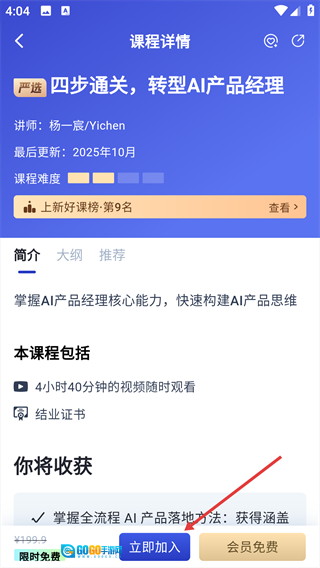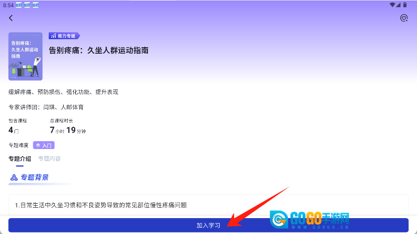 2、挑选具体的课程卡片,点击详情页底部的“加入学习”按钮。