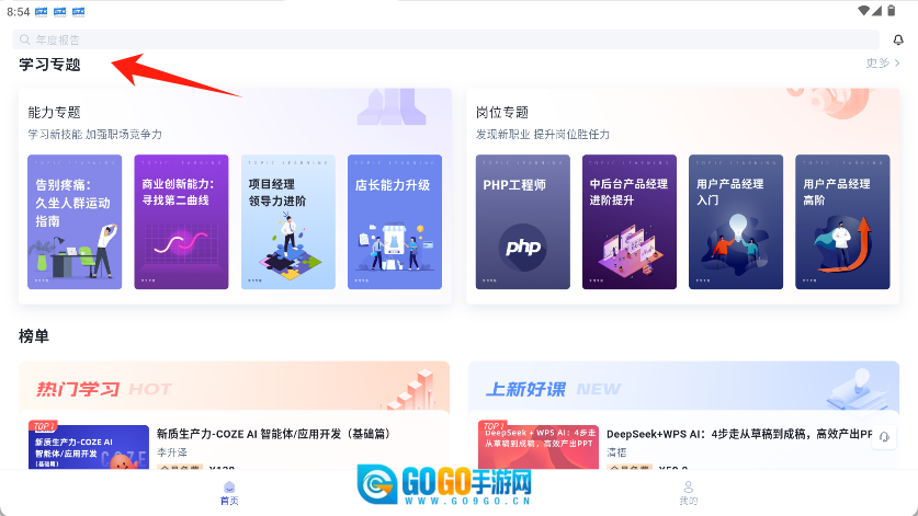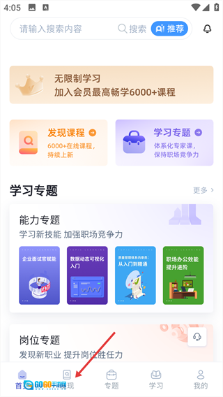 1、在学习专题标签页,进入能力与岗位专题分类浏览页面。