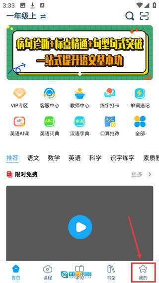 1、进入【一年级上】的学习首页后,点击页面底部的【我的】按钮,即可进入个人页面。