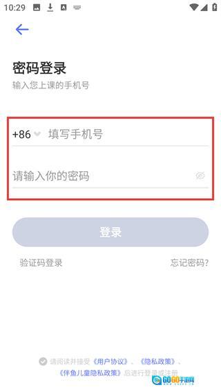 3、切换至【密码登录】界面后,需依次填写【手机号】输入框和【密码】输入框中的内容。