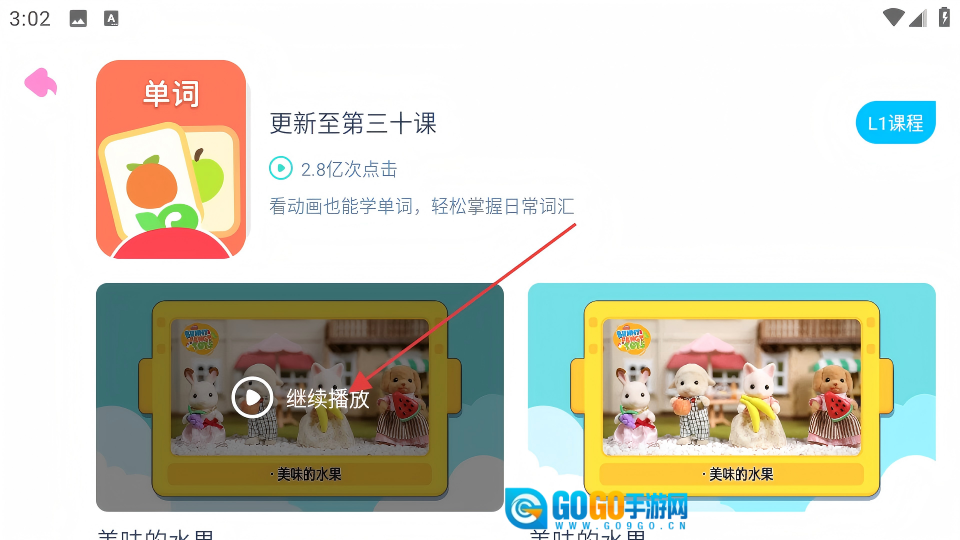 2、在单词学习页面,点击“继续播放”区域,即可进入学习模块选择页面。