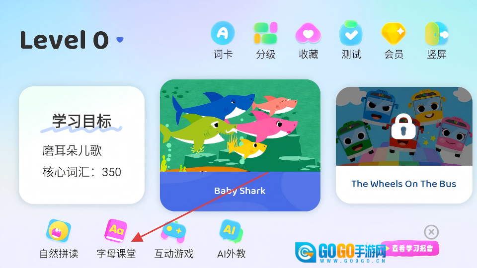 1、在Level-0界面,点击【字母课堂】选项,即可进入单词学习页面。