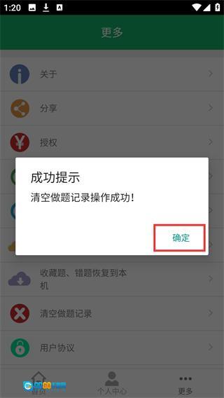 4、操作完成后会弹出【成功提示】的弹窗,提示清空做题记录的操作已成功执行,点击弹窗中的【确定】按钮就能关闭弹窗,至此整个流程就完成了。