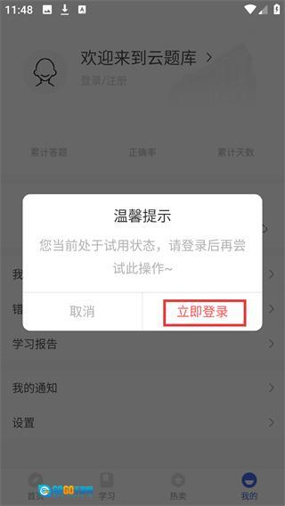 3、完成操作后会弹出【温馨提示】的弹窗,提示当前处于试用状态,点击弹窗中的【立即登录】按钮,就能继续进行后续相关操作。