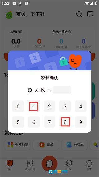 2、点击后会弹出【家长确认】的弹窗,此时需要计算【玖×玖】的结果,弹窗上设有数字按键,输入正确结果就能进入对应的功能页面。