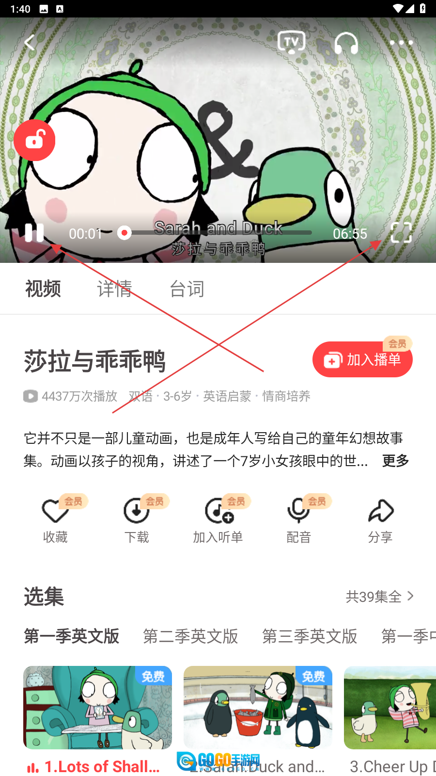 3、在播放页面,用户可以执行暂停、全屏观看等操作,也能够查看视频详情与台词内容,并且支持对视频进行收藏。