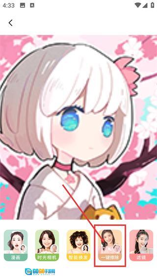 进入漫画形象编辑页面后,点击底部的【一键擦除】功能,就能快速清除图片里多余的元素,让画面效果得到优化。