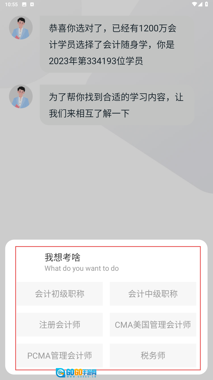 首次使用“会计随身学”时,需先选定备考方向,比如会计初级职称这类。