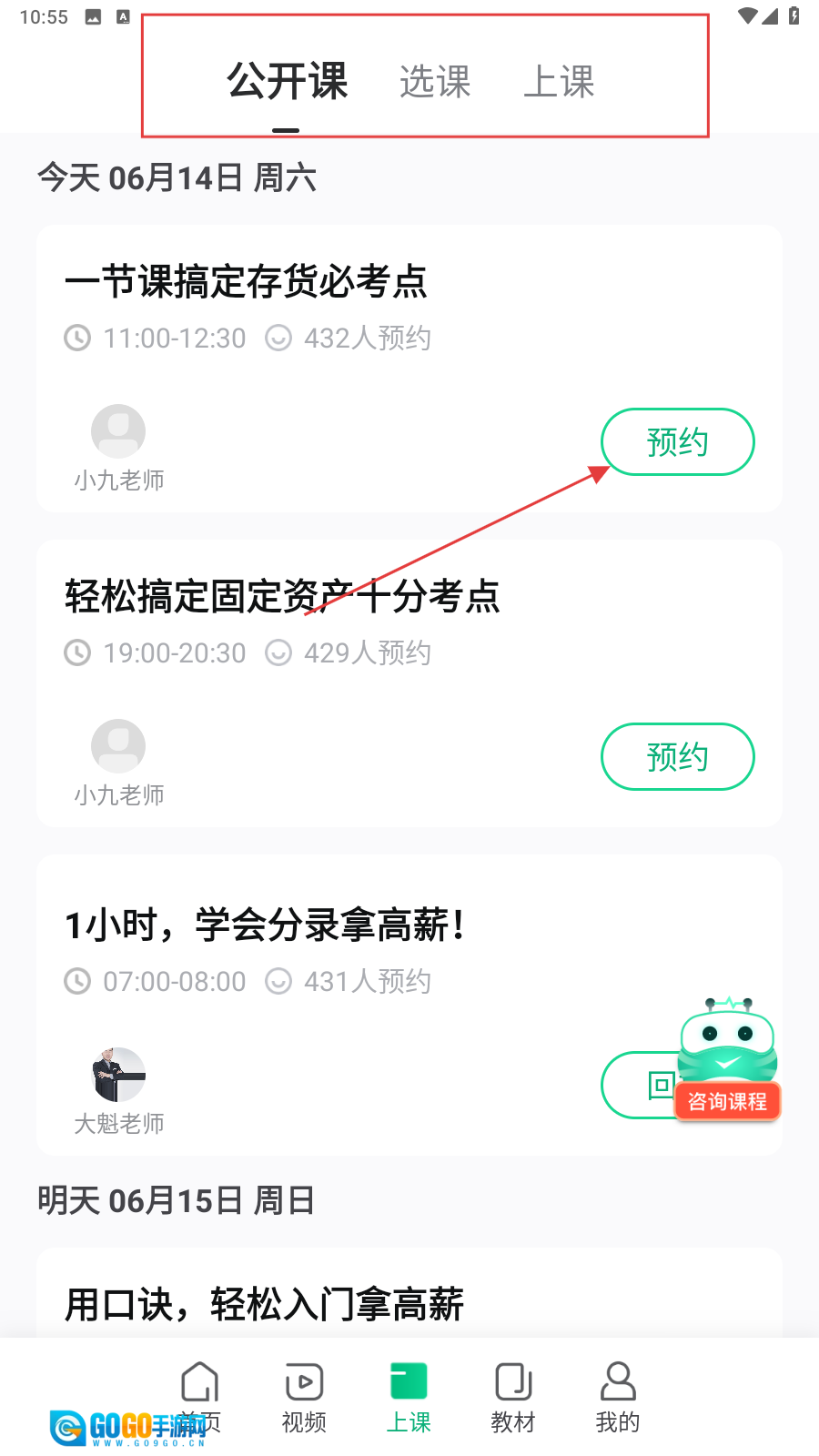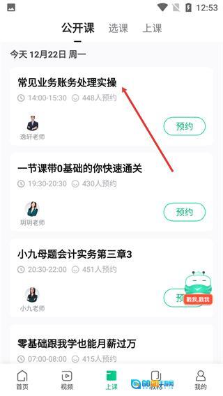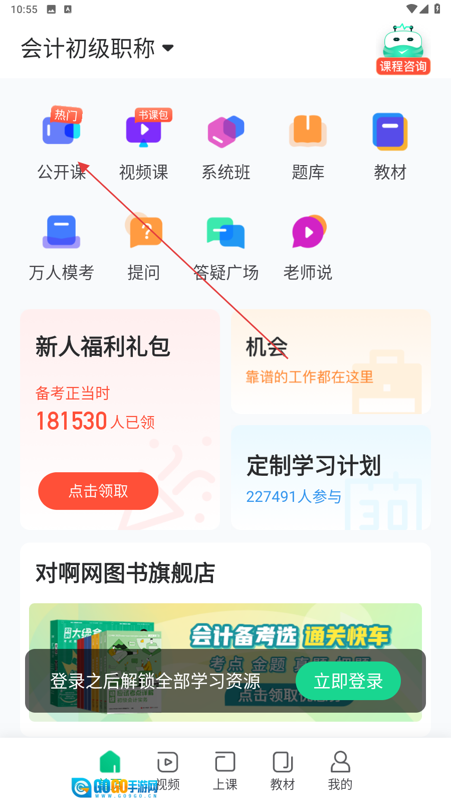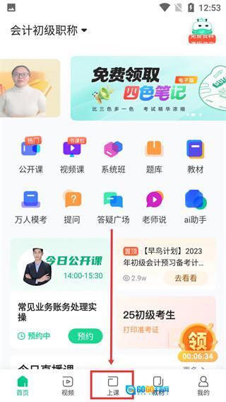 在会计初级职称学习的首页,点击底部的【上课】按钮,就能进入公开课板块。