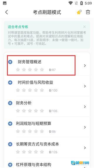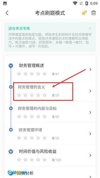3、在考点刷题模式页面,找到【财务管理概述】考点,点击该考点即可展开其下的细分知识点。