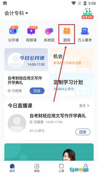 1、进入【会计专科】页面后,找到并点击【题库】功能按钮,即可进入题库板块。
