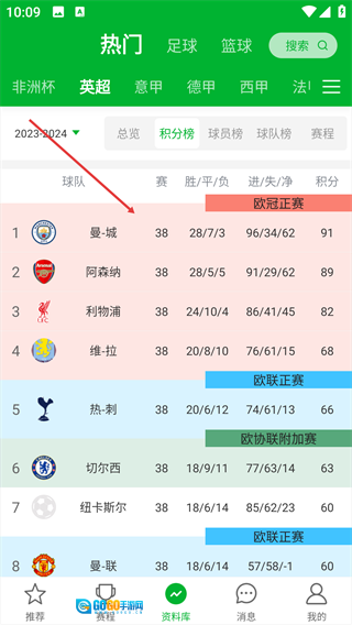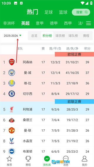 2、进入资料库页面后,能查看对应联赛的积分榜数据,接着点击上方的年份图标。