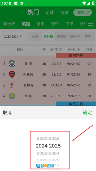 3、打开赛季选择弹窗,选定目标赛季后,即可切换赛事数据的统计赛季。