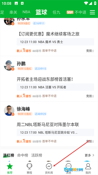1、进入篮球赛事页面后,点击底部导航栏中的【资料库】按钮。
