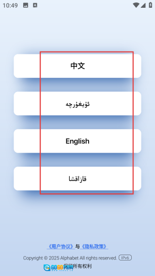 1、进入应用语言选择界面后,点击【中文】【维吾尔语】【English】等选项,确认所选语言即可进入应用。
