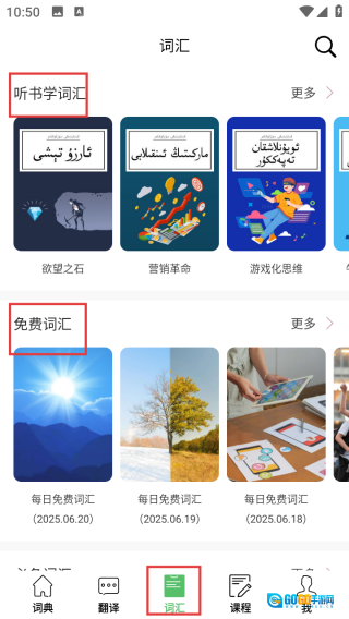 3、切换到底部的【词汇】模块,浏览其中的【听书学词汇】和【免费词汇】板块,查看相应的词汇内容。