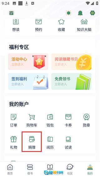 2、进入【我的】页面后,在【我的账户】板块里找到【捐赠】选项并点击,就能进入捐赠相关页面。