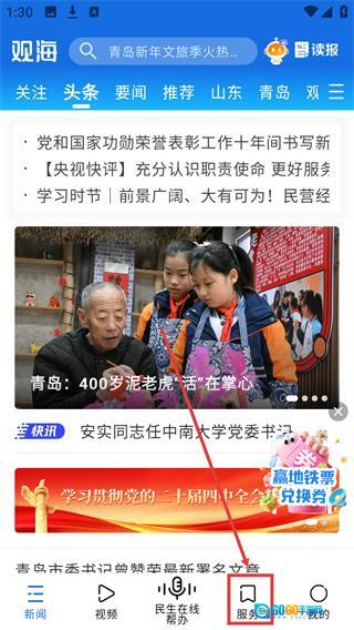 1、在【观海】首页底部找到并点击【服务】按钮,即可进入服务功能页面,使用各类生活服务。