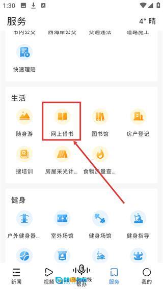 2、进入【服务】页面后,在【生活】分类下找到【网上借书】选项并点击,即可进入图书借阅相关页面。