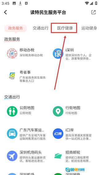 3、进入【读特民生服务平台】页面后,点击页面顶部的【医疗健康】分类选项,就能切换到对应的服务功能列表页面。