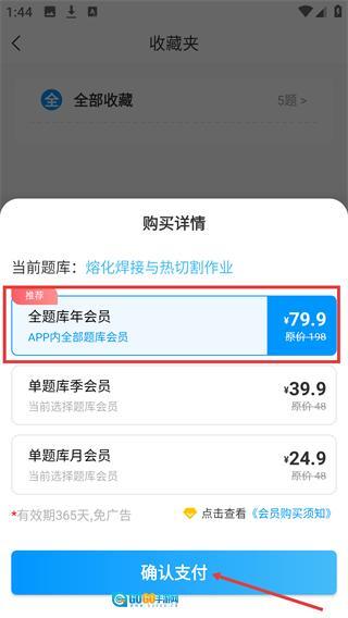 3、在查看收藏的题目时,若弹出会员购买的提示窗口,选择【全题库年会员】选项,然后点击【确认支付】按钮,即可进入收银台页面。