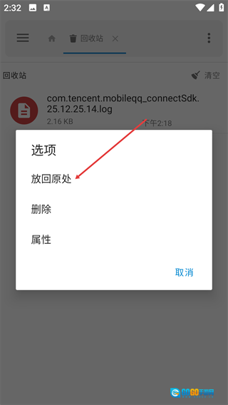 4、打开“选项”弹窗后,选择“放回原处”这一选项,就能把该文件恢复到它最初的存储位置。