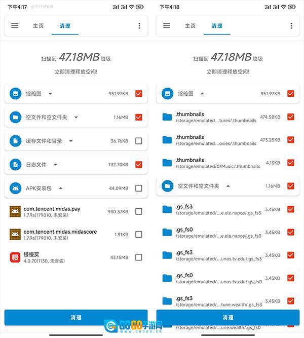 3.垃圾清理功能较为简单,可自动扫描常规垃圾文件,下拉即可查看清理详情。