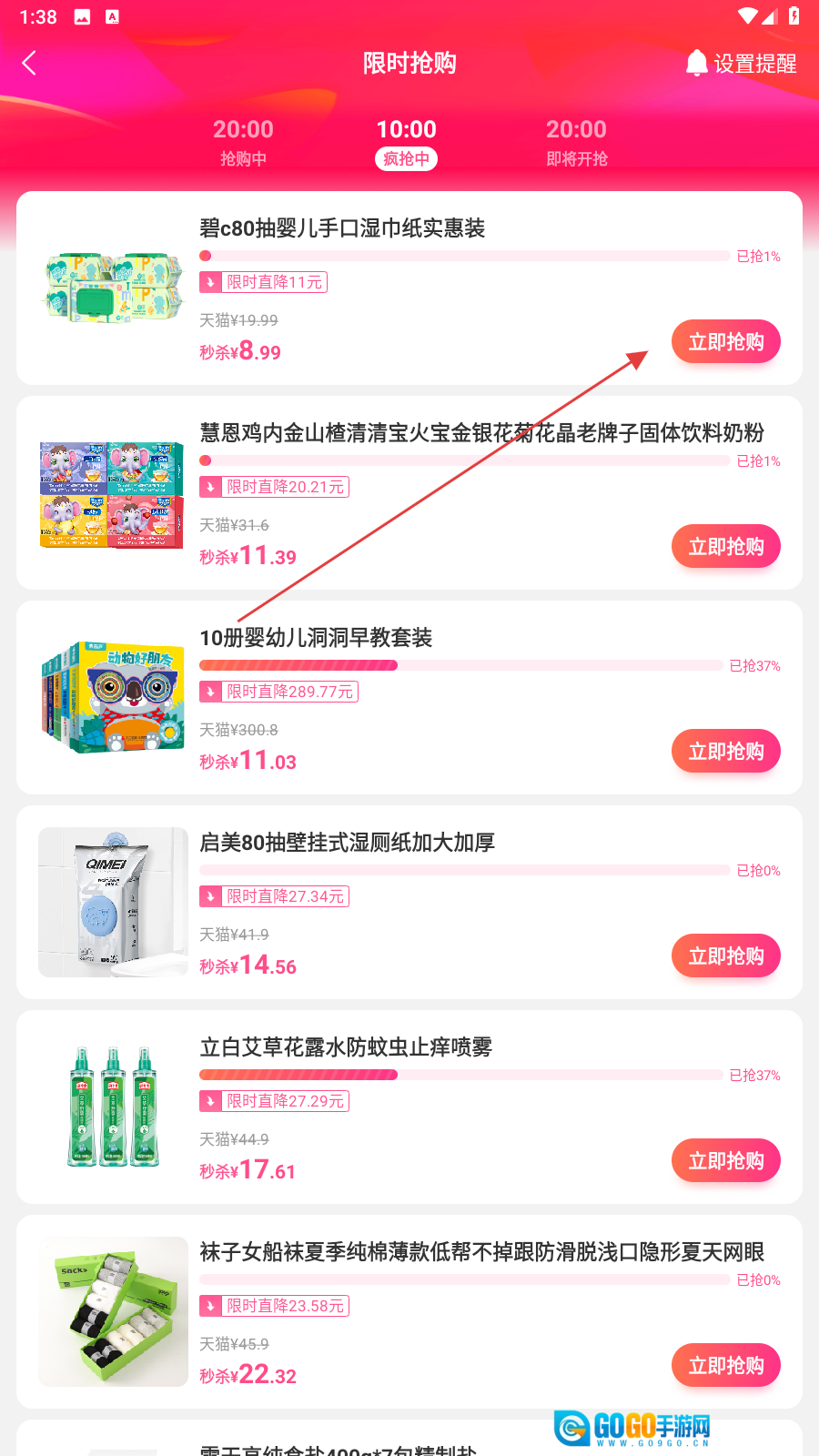 在限时抢购页面,找到你喜欢的商品后,点击它旁边的【立即抢购】按钮,就能快速完成下单操作。