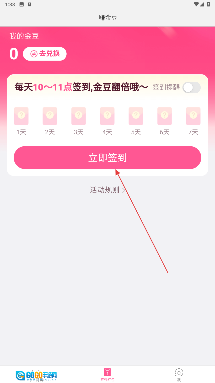 4、点击【立即签到】按钮,就能参加签到活动,赢取金豆之类的奖励。