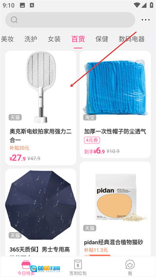 进入首页后,你可以借助顶部的【女装】【百货】等分类来切换商品类目。