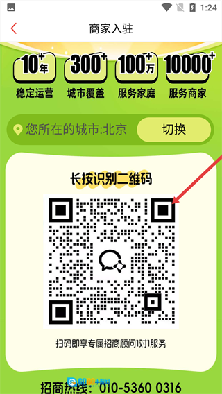 4、在确认好当前城市信息后,长按并识别页面上的二维码,就能联系到专属招商顾问,从而获取商家入驻的具体流程指导。