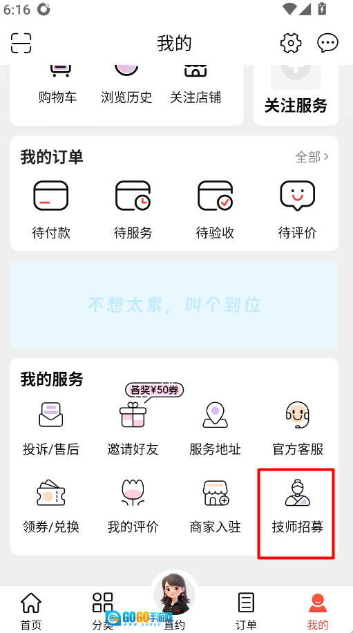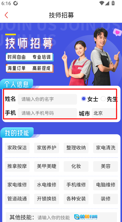 4、技师可通过招募入口提交申请,具体操作是点击左下角的“技师招募”按钮。