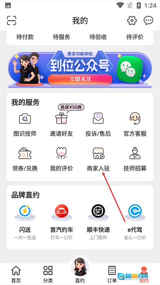 2、进入“我的”页面后,在“我的服务”板块里找到【商家入驻】这一选项。