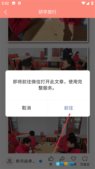 4、当弹出提示框后,点击【前往】按钮,即可跳转至微信端以使用该文章的完整服务。